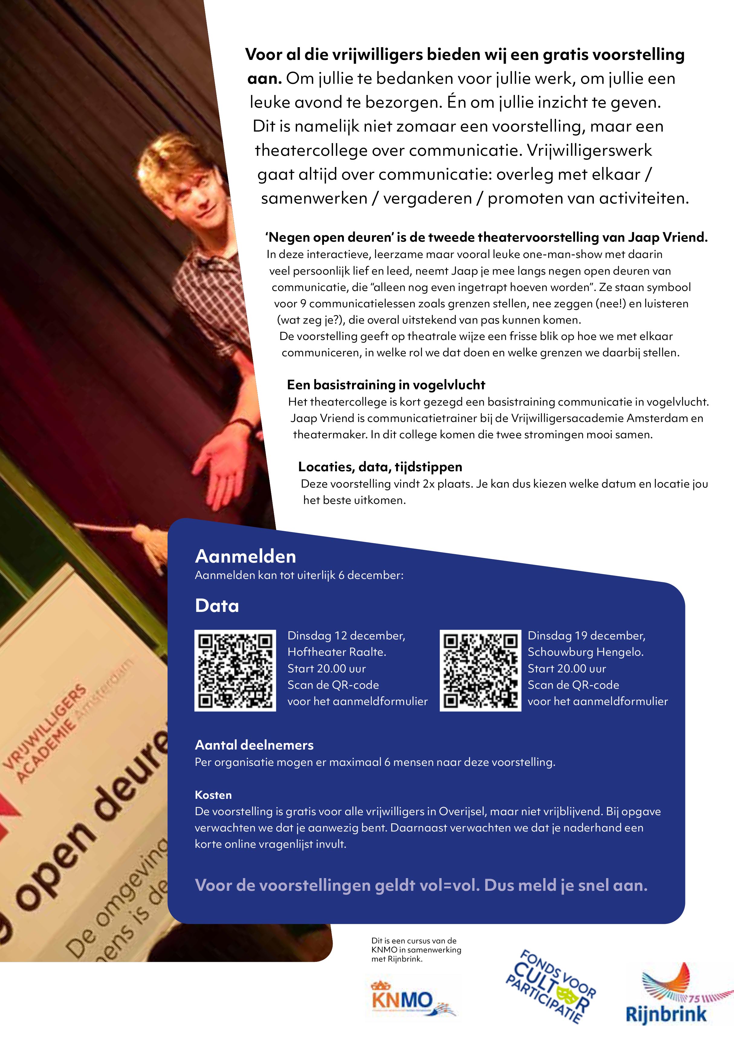 Gratis voorstelling 'De Negen Open Deuren' voor šš„š„š vrijwilligers in Overijssel!
